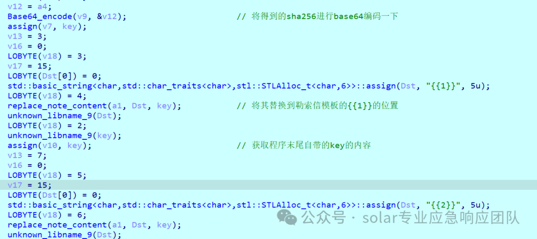 4.进入到sub_E82CBD函数函数内部可以看到具体的替换过程,其中将上面得到的sha256编码成base64的形式替换勒索信模板的{{1}}的位置,将程序末尾自带的key替换到勒索信模板的{{2}}的位置即可完成。