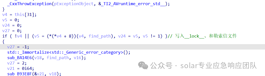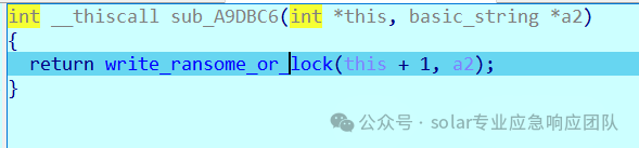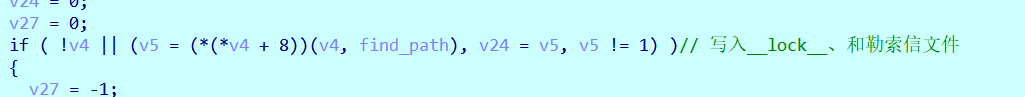1.继续上面的文件加密前半部的内容进行详细描述,首先对于写入勒索和写入__LOCK__文件都是由sub_A9DBC6函数实现