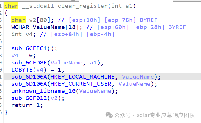 1.在执行完毕加密流程后,将执行主功能函数中的clear_register函数,来实现对写入自启动的注册表的删除
