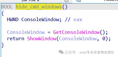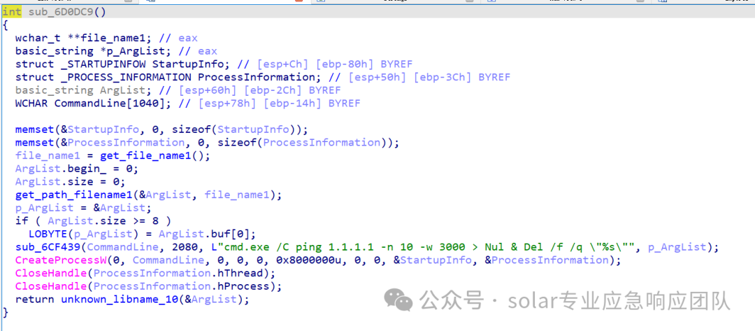2.进入该函数的内部实现,可以看到主要是调用CMD进行命令执行,实现了删除自身,执行命令是: