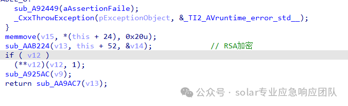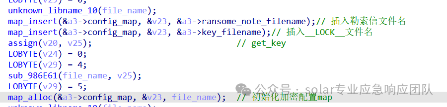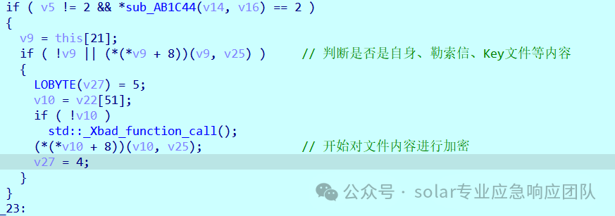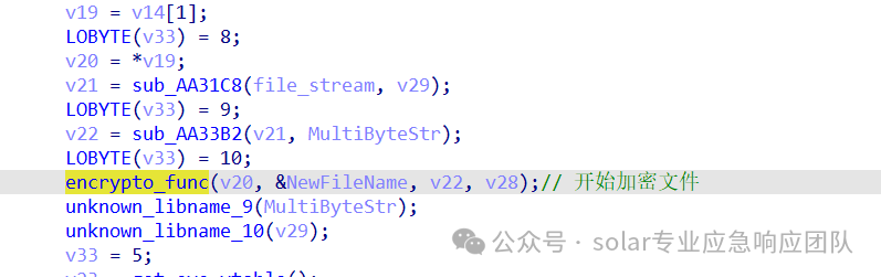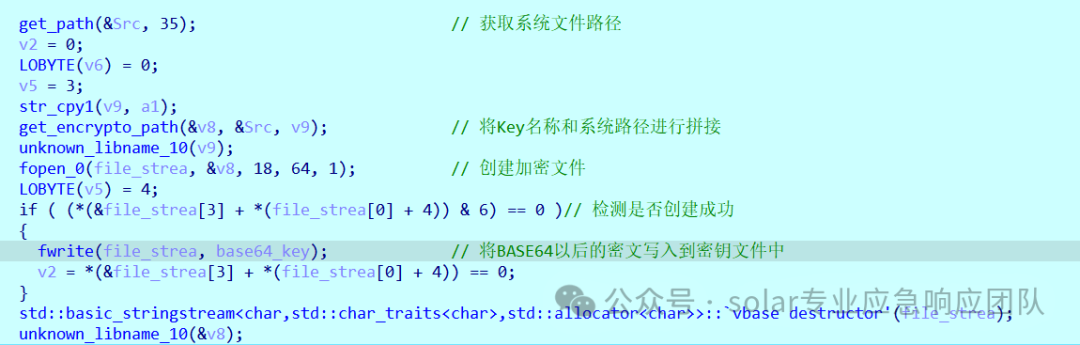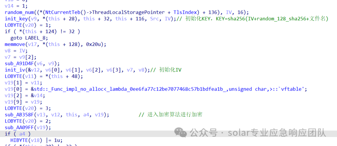 5.进入到sub_AAAEC7函数中可以看到,该函数主要实现了加密密钥的生成与加密对象的初始化、文件内容加密、对Key进行加密和加密KEY后的数据的写入等操作,其中对文件进行加密的函数为sub_AB358F函数。