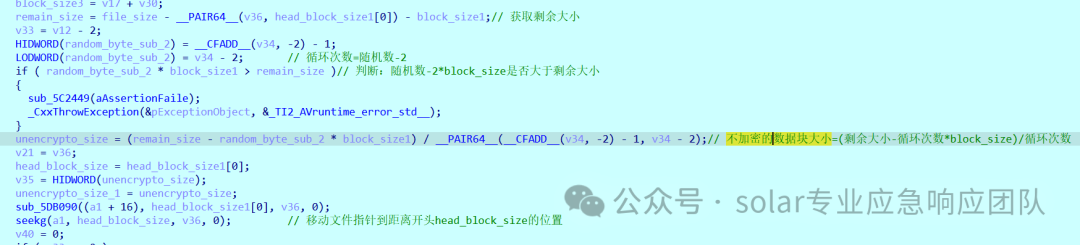 8.在对一个文件的头部数据和尾部数据加密完毕后,将要执行对于中间部分即剩余大小的数据进行加密,首先获取了一下剩余中间部分的字节大小,又计算了一下循环次数(循环次数=随机数-2),最后计算了一下不进行加密的数据块大小,计算方式:不加密数据大小=(剩余大小-循环次数*block_size)/循环次数。