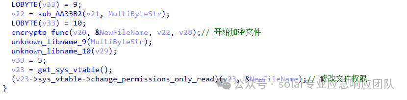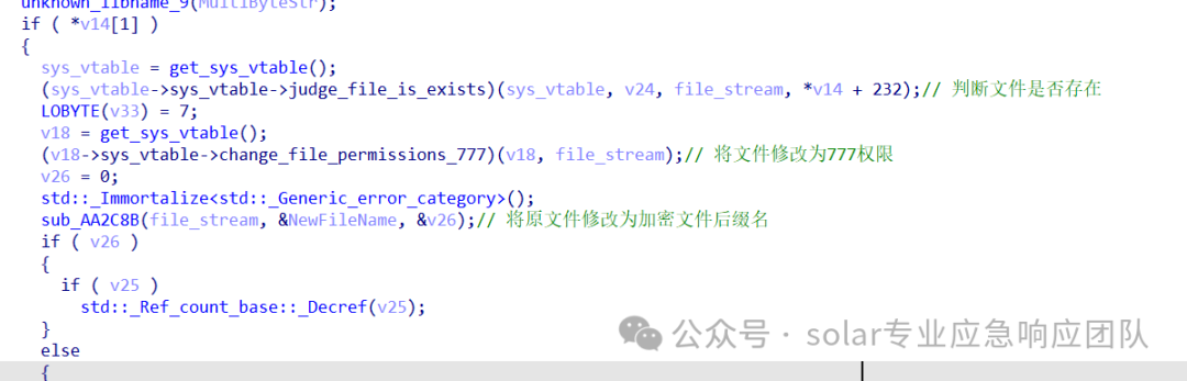 3.之后该函数调用了主体函数中的judge_file_is_exists函数来判断加密文件是否存在,又调用了主体函数的change_file_permissions函数给该文件一个可读可写可执行的777权限,最后对将文件的名称修改为了加密文件的名称。