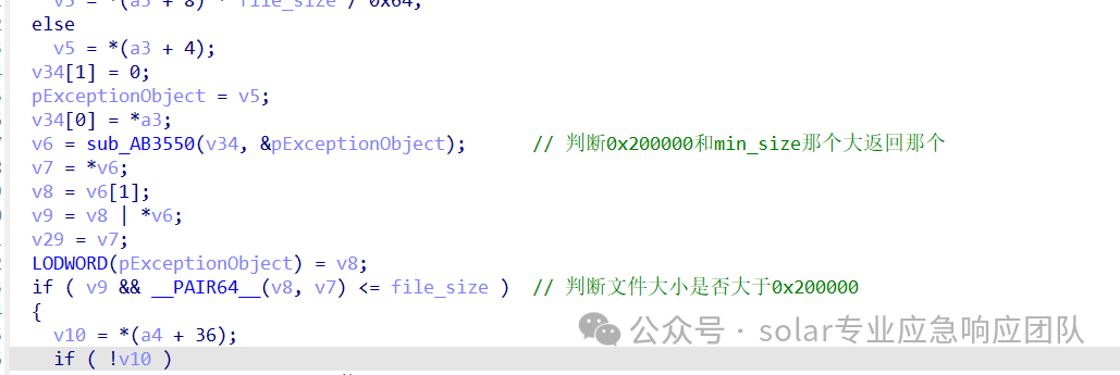 6.进入到sub_AB358F函数可以看到获取文件的大小,并且进行判断,之后会根据文件的大小是否小于0x200000字节,来选择是全加密,还是分段加密。