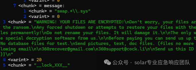 该勒索病毒首先通过分析TLS回调函数,实现了程序的随机数生成和池初始化机制。接下来,通过手工重建了程序的虚表结构,从而解析了主要功能函数,这些函数包括文件操作和注册表操作等一系列主要函数,恢复结构之后病毒先读取了自身配置文件,获取了后面功能所需的信息,紧跟着实现了隐藏CMD窗口,避免被用户发现,具体是通过调用GetConsoleWindow和ShowWindow函数来实现的,完成了窗口隐藏后,程序会将自身配置写入到开启启动项的注册表中,在当前桌面和系统比较重要的系统路径中写入勒索信与密钥文件,接着就是完成最重要的目录遍历加密,遍历的同时写入LOCK隐藏文件和勒索信文件,文件加密运用了AES-CFB算法,加密完成后将KEY等信息运用RSA加密算法将其写入到文件末尾,最后对文件的权限设置成了只读,完成了以上所有的功能后,该病毒会执行删除自身,并且将写入到开启启动项中的注册表内容清楚,其中一个重要部分是恢复protobuf对象及其数据流,提供了protobuf对象的定义及恢复方法,这对于理解程序的数据传输和处理机制至关重要。