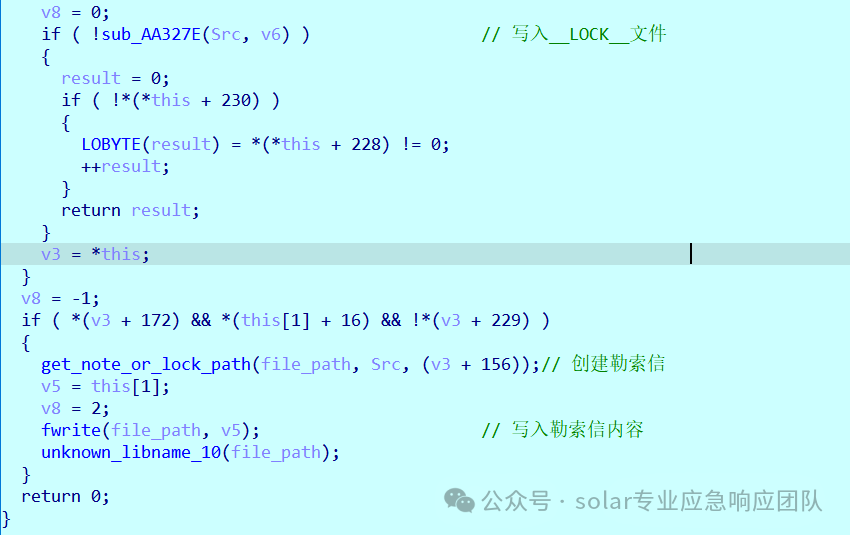 1.还是接着勒索信的写入部分继续说,可以看到写入LOCK函数是通过sub_AA327E函数实现的