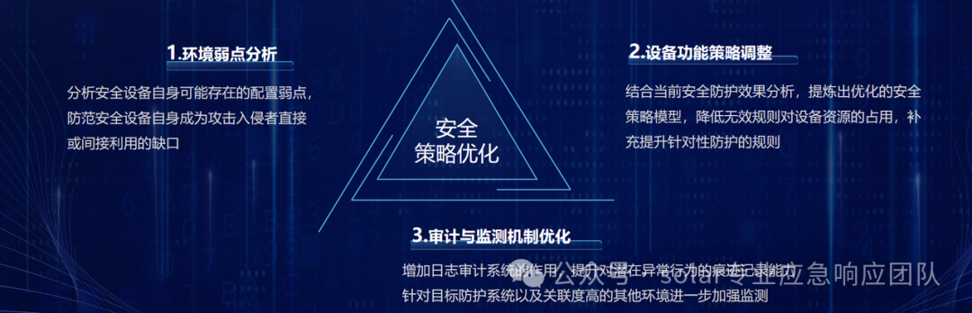 通过对安全现状的梳理和分析,识别安全策略上的不足,结合目标防御、权限最小化、缩小攻击面等一系列参考原则,对设备的相关配置策略进行改进调优,一方面,减低无效或低效规则的出现频次;另一方面,对缺失或遗漏的规则进行补充,实现将安全设备防护能力最优化。