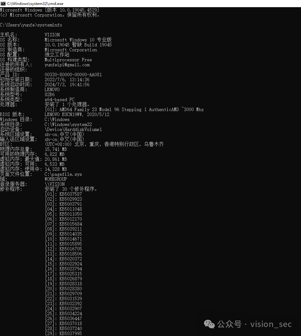 wmic computersystem get model,manufacturer,name,systemtype //获取计算机系统信息