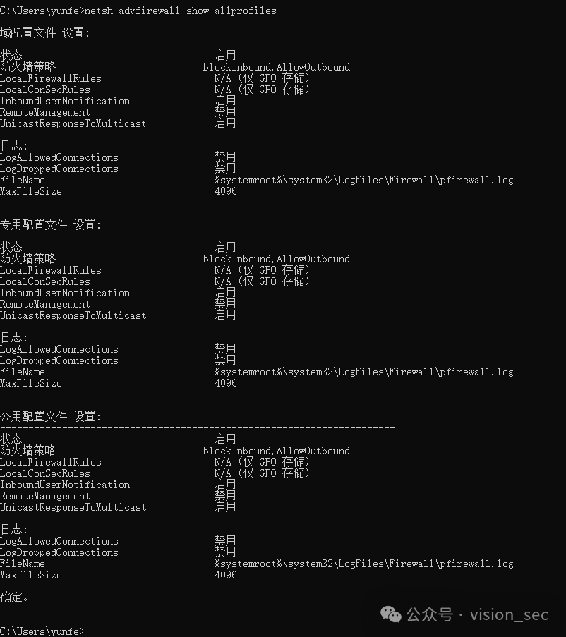 netsh advfirewall show currentprofile //显示当前防火墙配置文件