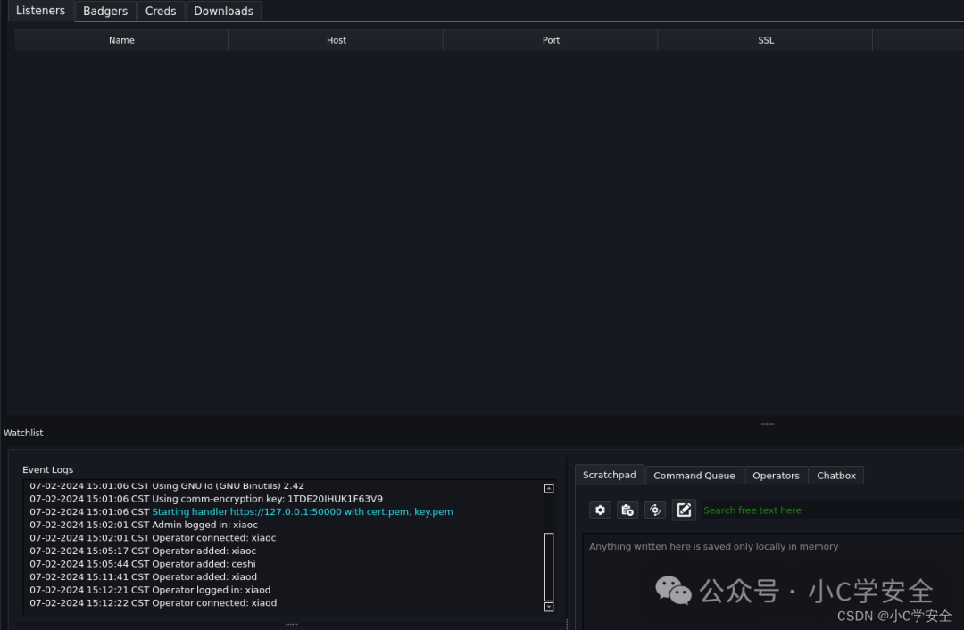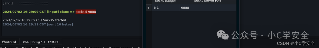 每个会话可以开启一个TCP监听器。来自不同主机的 TCP 獾可以连接到该监听器进行横向移动。 可以使用 pivot_tcp 命令启动它。 可以通过选择 服务器->TCP 监听器 查看所有活动的 TCP 监听器。