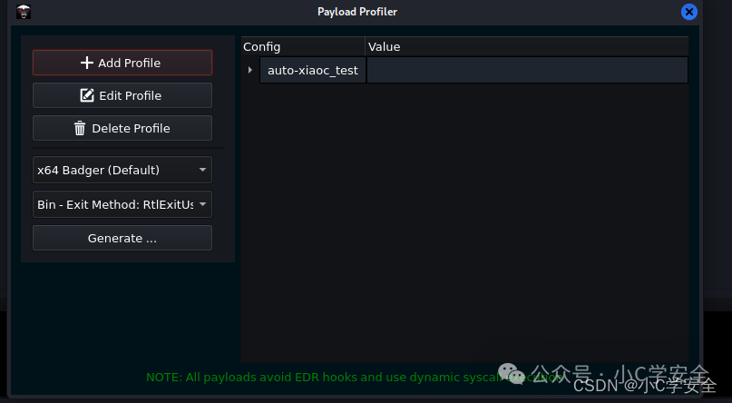 有效载荷配置文件提供了多种选项来配置和构建獾。这些配置独立于监听器配置文件工作。这意味着操作员可以编辑、删除或创建新的有效载荷配置文件,并在进程注入、配置文件迁移或从它们创建新的 shellcode、DLL 或服务可执行文件时动态使用它们。 操作员还可以将配置文件存储在当前 C2 的备份命令和控制服务器中,并使用它们将备份 c2的配置文件直接注入当前有效载荷中,从而允许操作员在无需在磁盘上放置文件的情况下切换 C2。 要添加新配置文件,请选择C4 配置文件->配置文件->有效载荷配置文件,然后单击添加配置文件按钮。