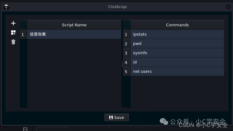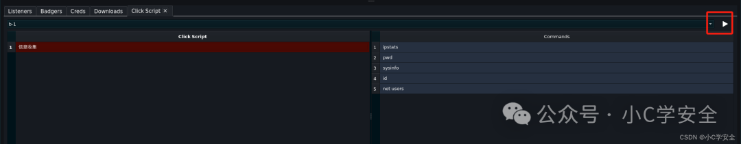 点击脚本是一项功能,允许操作员自动执行分组命令。 与允许操作员在獾首次连接时自动执行多个命令的 Autoruns 功能不同,点击脚本是多个命令的列表,这些命令可以链接在一起,以便在任何时候按顺序执行一个命令。 这有助于自动执行属于 MITRE ATT&CK 不同战术和技术的命令,这些命令可以在紫色团队参与期间链接在一起。 下面是一个发现型命令的示例,这些命令被分组到一个名为“发现”的单个 Click 脚本中。 此脚本也可以通过在Commander 中选择 C4Profiler->Clickscripts 或从 C4 Profiler->Profiles->Upload Command Profile 加载其 JSON 配置文件来创建。 要运行这些 Click 脚本,请右键单击一只獾,加载一个 Click 脚本,然后单击运行按钮。