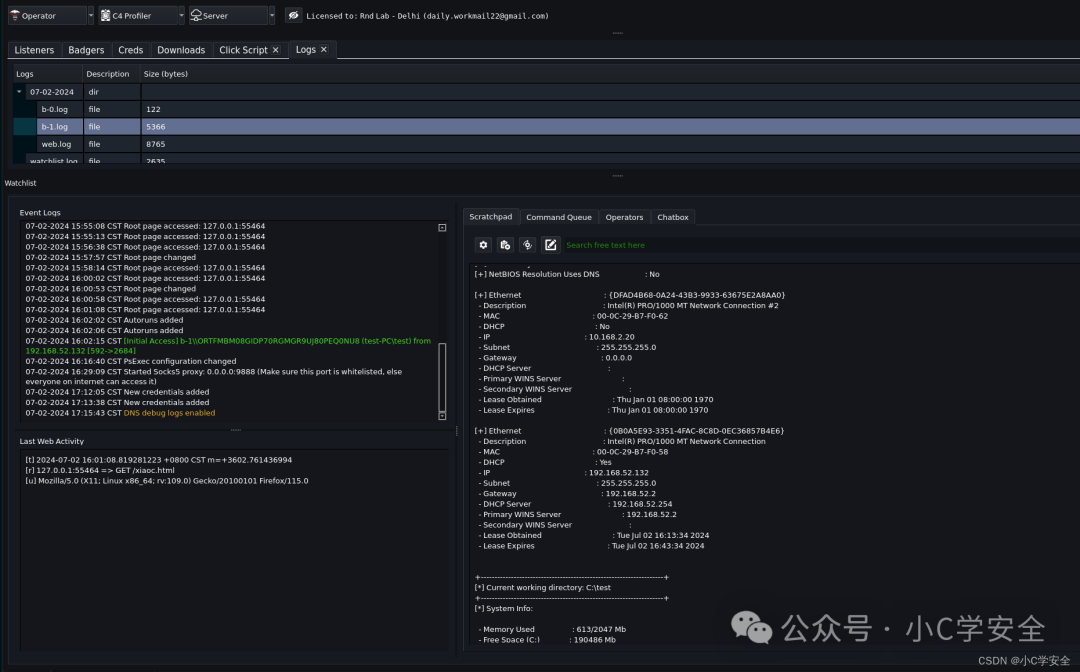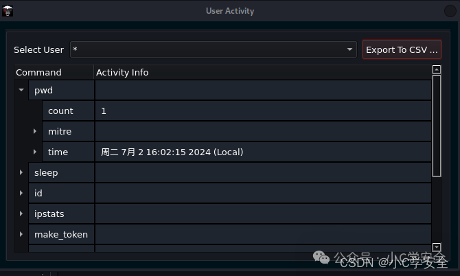 指挥官提供所有用户执行的命令的详细日志,以及用于审计目的的相应 MITRE 战术和技术。 这包含简短命令、完整命令、时间和 MITRE 信息,说明命令何时执行以及操作员执行特定命令的次数。 您可以通过选择服务器->操作员活动来访问活动日志。您可以通过从下拉菜单中选择操作员并将日志导出到 CSV 来筛选特定操作员