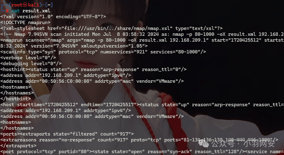 nmap 192.168.209.1 -p 80-1000 -oX result.xml
