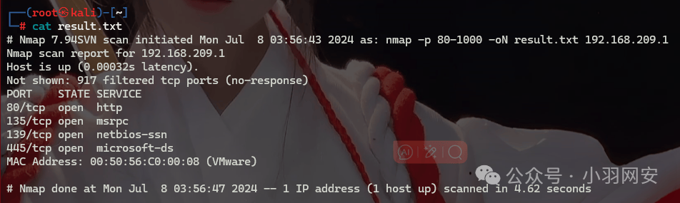 nmap 192.168.209.1 -p 80-1000 -oN result.txt
