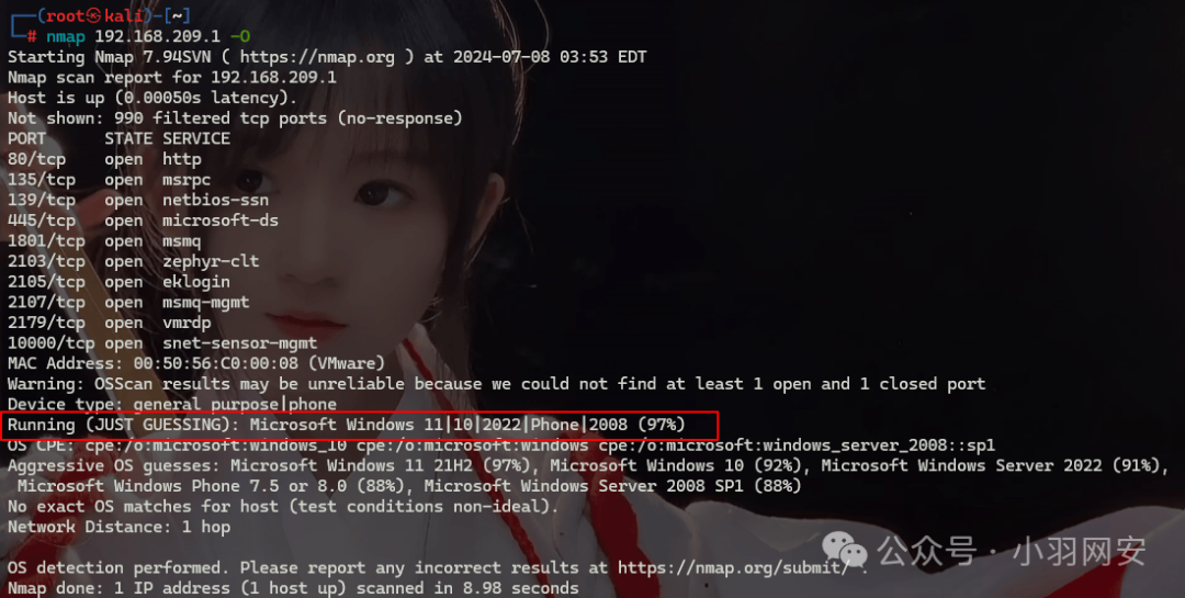 当识别不出具体版本时,Nmap会以概率的形式列举出可能的操作系统,如上图所示。