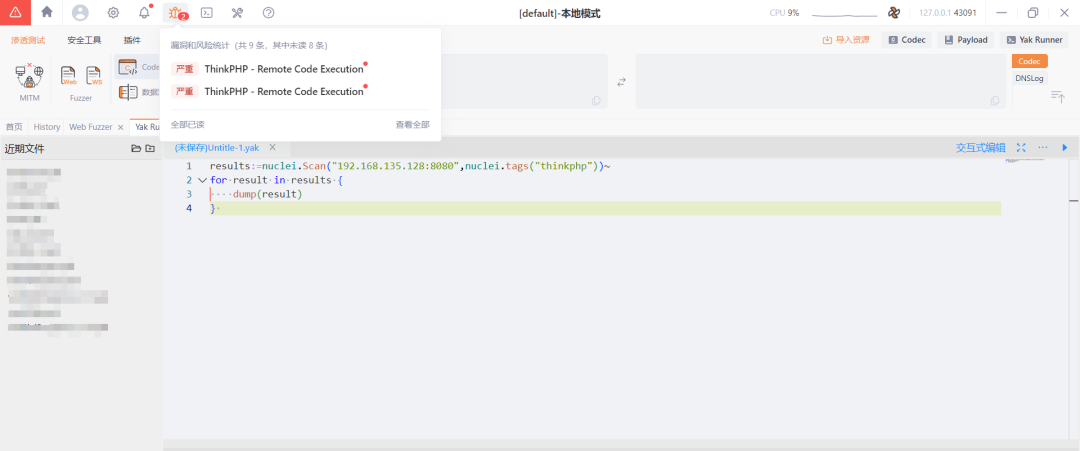 在Yakit中使用nuclei很简单,只需要几行代码。在Yak Runner中,使用下面代码,指定扫描的目标与选项,便能调用nuclei的漏扫能力: