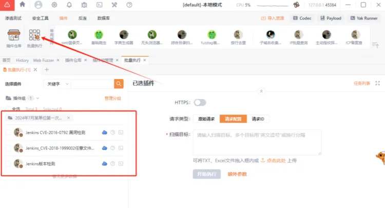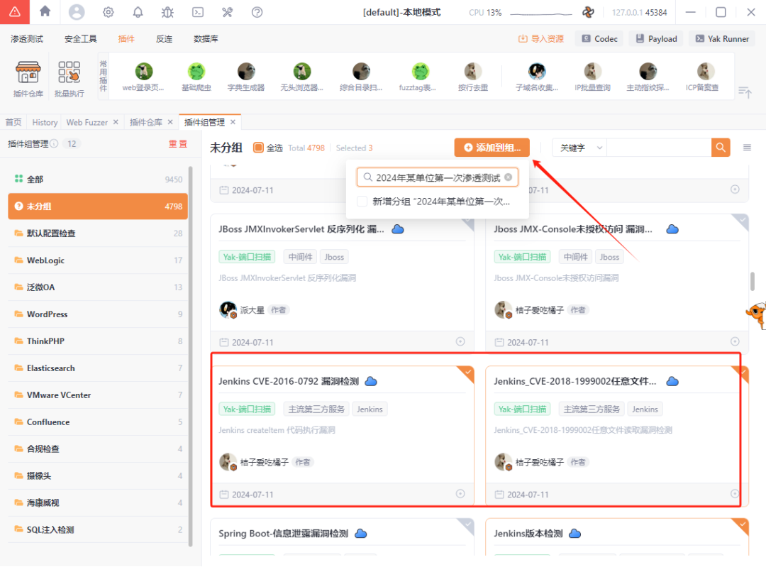 得益于Yakit的插件系统,你可以很方便的管理你所拥有的PoC,你可以将你的PoC按照资产、项目或者时间进行分类成组,以便下次需要的时候可以一把“梭哈”。