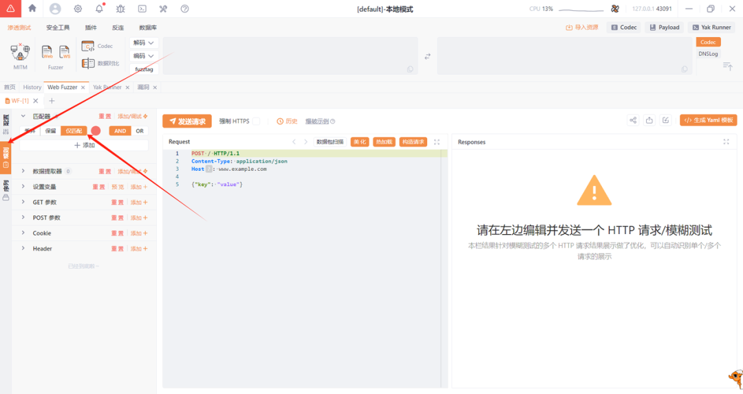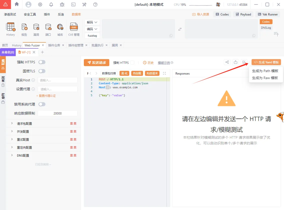 使用Web Fuzzer,可以将数据包的内容快速转化为Yaml格式。只需在Web Fuzzer标签页中点击生成Yaml模板,即可一键生成PoC。