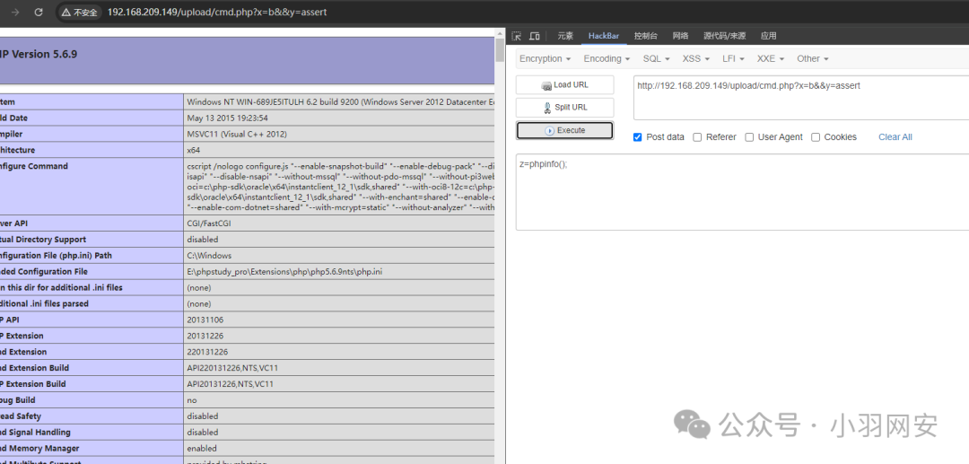 上图可以看到并没有检测到,用**「get方式」传如参数「x」和y,值分别为「b」和「assert*** ,再用」**POST方式*传如参数z,值为自己想执行的命令