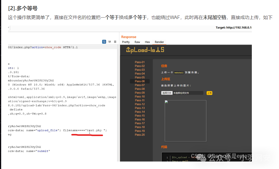 这个操作就更简单了,直接在文件名的位置把**「一个等于」换成「多个等于」,也能绕过WAF,此时再在「末尾加空格」**,直接成功上传,如下