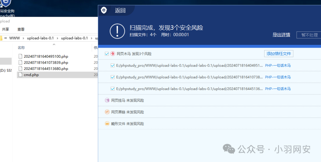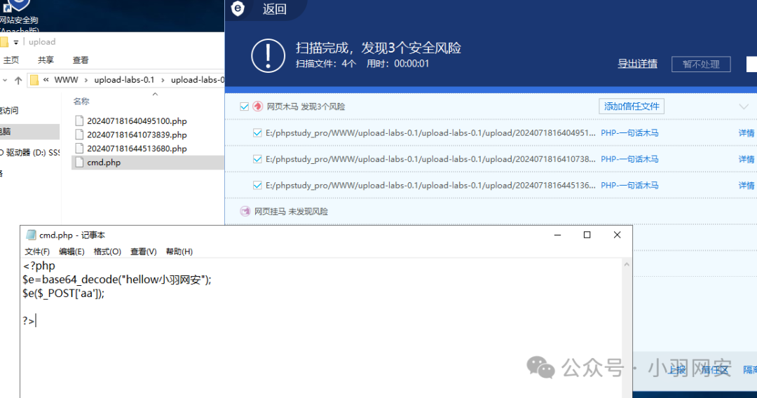 我们所使用的一句话木马是市面上**「最为常见」的类型,因此几乎所有的WAF(Web应用防火墙)都能识别并拦截这段内容。这正是导致我们「上传后无法访问」**的根本原因。为了验证这一点,你可以尝试开启安全狗的木马扫描功能,看看它是否能被检测出来,从而判断其是否具备免杀能力。
