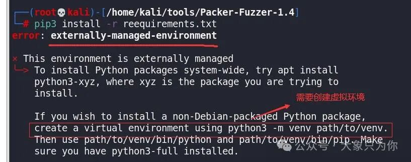 Packer Fuzzer工具是使用Python3语言开发,因此运行使用要确保环境安装有Python3.x和pip3。以Kali系统为例