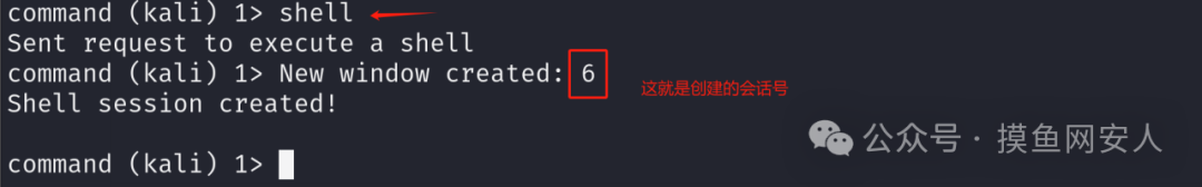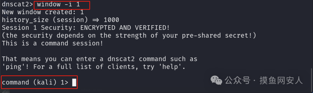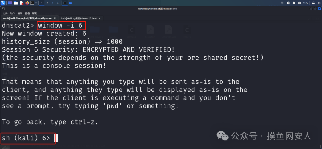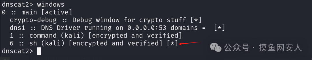 ctrl+z返回到dnscat2界面输入windows查看所有通道,然后进入window -i id反弹回来的shell会话