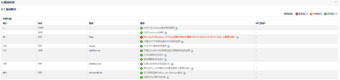 无论是哪种漏洞扫描工具,工具自身都会通过某种方式向工具使用者呈现报告的信息,比如通过漏洞报告导出功能。漏洞扫描报告用于记录扫描过程中发现的漏洞信息,通过漏洞扫描报告,用户可以了解网络、主机、应用等安全状况,对相关的风险进行处置,漏洞进行修复。