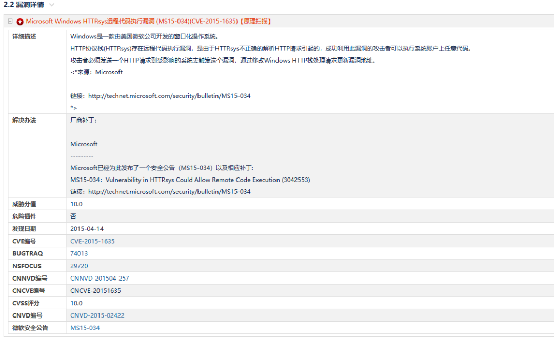 RSAS漏洞扫描是针对主机漏洞的,要定位漏洞位置的话,需要看漏洞概况部分,看这个漏洞是在主机的哪个端口扫描到的,通过这个端口再去确定是什么应用产生了漏洞。漏洞详情部分给出了详细描述,描述中包含参考链接,后面给出了分值和漏洞的CVE编号、CNNVD编号、微软安全公告编号,并可以查看更加详细的漏洞信息和描述。