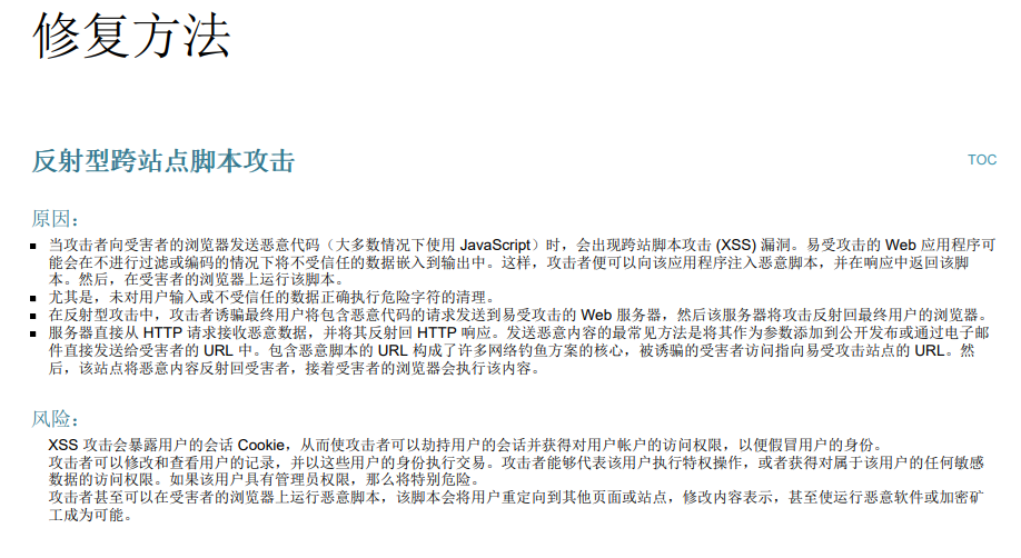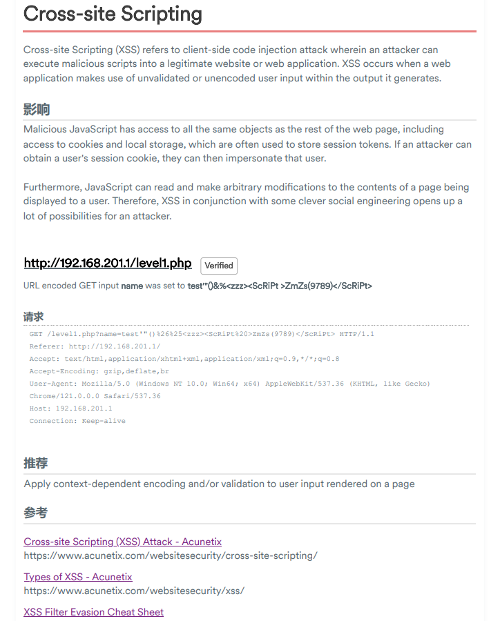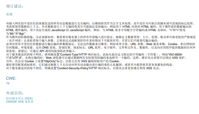 下面的推荐是给出的修复建议,只有简短的一句“将上下文相关的编码和/或验证应用于页面上呈现的用户输入“,比较简单,需要用户花点时间去理解,但在后面的参考里面给出了多篇他官网对这个漏洞详细的分析和修复建议。