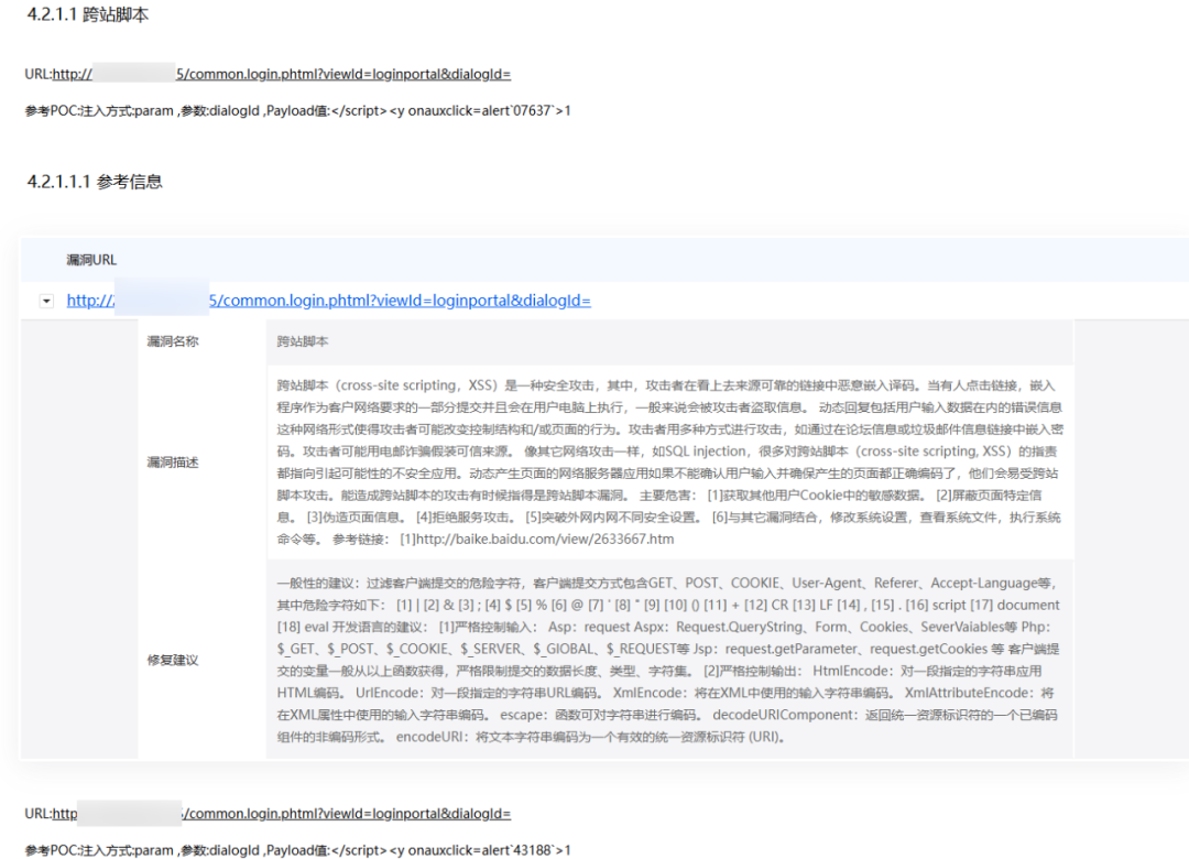 显然,上述漏洞扫描工具都假设用户是专业的安全技术人员,而忽略了具体修复漏洞的非安全人员,比如产品经理、研发人员、实施人员,现实中同步漏洞信息时往往又是依据工具扫描的漏洞报告进行原文复制,这就可能造成非安全人员对于漏洞修复的恐惧甚至反感。因此,详尽的漏洞信息有助于安全漏洞的修复,如下所示: