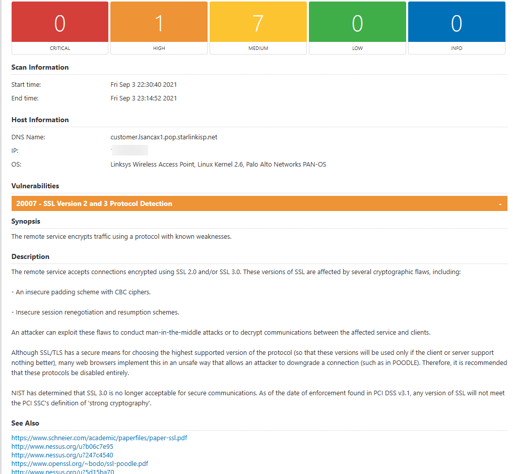 Nessus的漏洞报告是按照主机列表来展示的,直接展示这个主机下面有多少中高低漏洞,以及开始扫描时间、结束扫描时间、IP地址、服务器信息等。漏洞详情中再将漏洞一个一个单独列出来,并和漏洞数量的颜色对应,红色为最严重,橙色为高危,黄色为中危,绿色低危。
