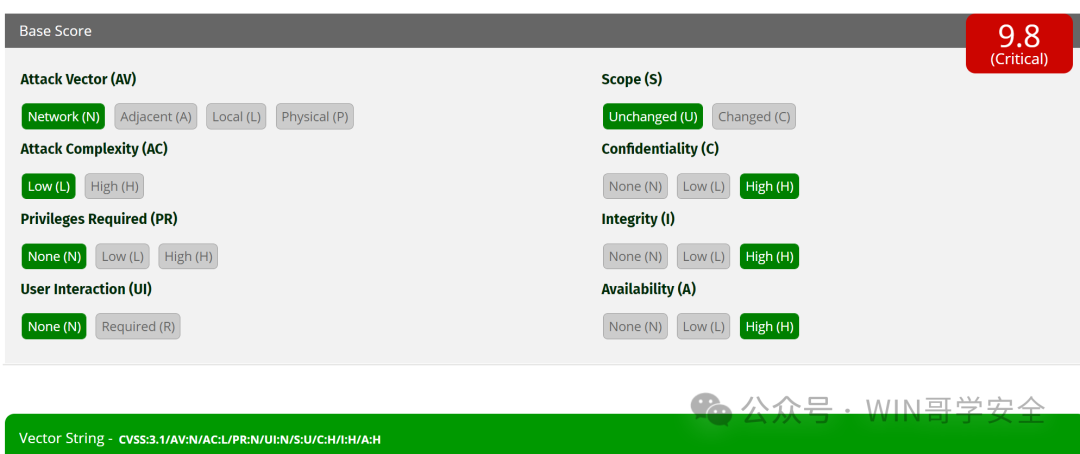评分为8.8高危, 矢量:AV:A/AC:L/PR:N/UI:N/S:U/C:H/I:H/A:H 攻击媒介(AV):相邻攻击复杂度(AC):需要的权限(PR):无用户交互(UI):无范围(S):不变机密性(c)完整性高高方可用性(A) :高 大概可以知道这个需要物理位置在WIFI范围内,可以影响CIA全部属性的漏洞,要是不是攻击媒介(AV)影响可是妥妥的超危漏洞: