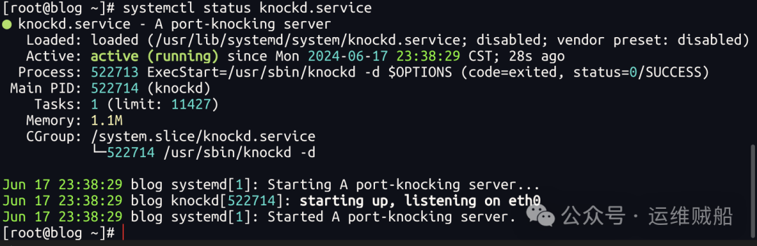 # 启动并查看knockd的运行状态