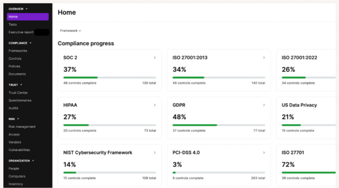 "今天的Vanta,我们仍然在做很多SOC 2的工作,但我们正在做的很多工作都是围绕着如何帮助公司建立安全计划展开的。"Cacioppo说。"然后他们如何获得信任?这其中有合规性的部分,有信任中心,有实时安全状态页面和问卷自动化,但这些背后的理论是:如果你能让人们炫耀他们所做的所有出色的安全工作,从而获得信用(实际上意味着收入),他们就会做更多出色的安全工作。......当我们谈到信任时,软件中的很多信任,尤其是B2B软件,都是围绕着以下几点展开的:我能把客户的数据交给你们吗?"