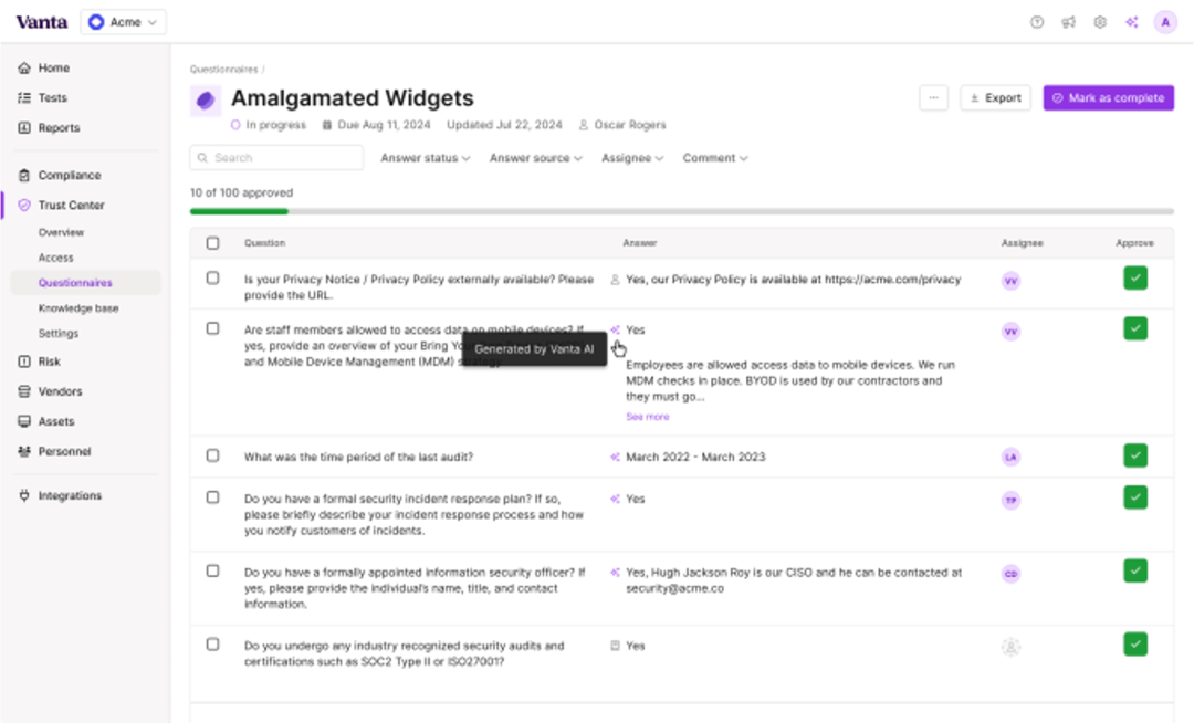 例如,该公司最近推出了问卷自动化服务。例如,许多公司在引入新供应商时都会使用安全审查问卷。填写这些问卷需要花费很长时间,部分原因是这些信息存在于许多不同的系统中。到目前为止,Vanta的质量指标显示,该工具提供的答案中约有80%被人工审核人员立即接受。在缺失的20%中,很多只需要对措辞稍作修改。
