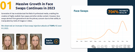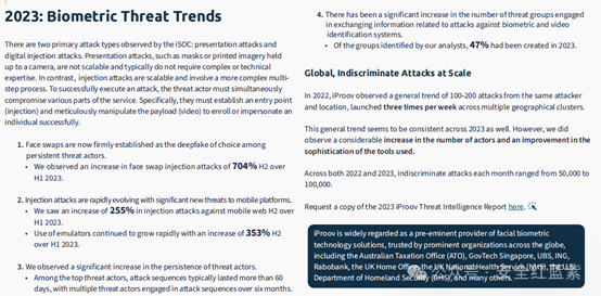 iProov在2024年威胁情报报告《生成式人工智能对远程身份验证的影响》中发现,免费和低成本的换脸工具、虚拟摄像头和移动模拟器正在加速越来越多专注于深度伪造的威胁行为者的努力。2023年使用“换脸”技术试图绕过远程身份验证的Deepfake攻击增加了704%。