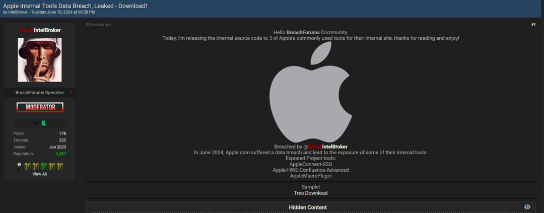 根据Breach Forums上的一篇帖子,IntelBroker 声称于 2024 年 6 月访问了 Apple 的系统,并获取了以下工具的源代码: