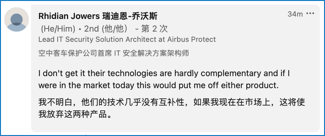 **但最终Allie Mellen还表示,对立终究是对立。**合并将给两家公司带来挑战。因为LogRhythm是一家成立于2003年的老牌安全公司,专注于套件式产品,而Exabeam则是一家成立于2012年的年轻公司,专注于模块化的独立产品。此外,这两家公司近年来都面临着合并无法解决的挑战:难以跟上市场创新和向云计算转型的步伐。LogRhythm传统上专注于中端市场,而Exabeam则积极追求大型企业交易,这凸显了必须弥合的目标市场差异。