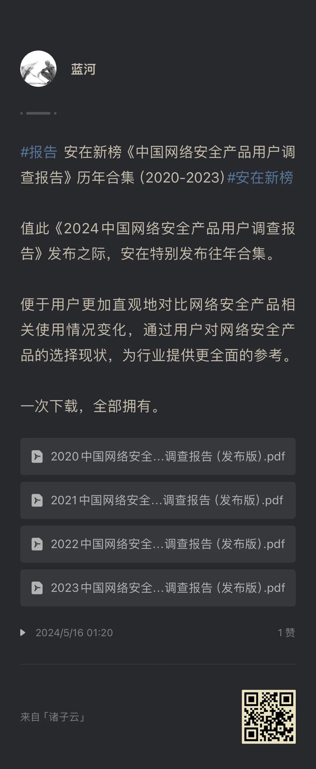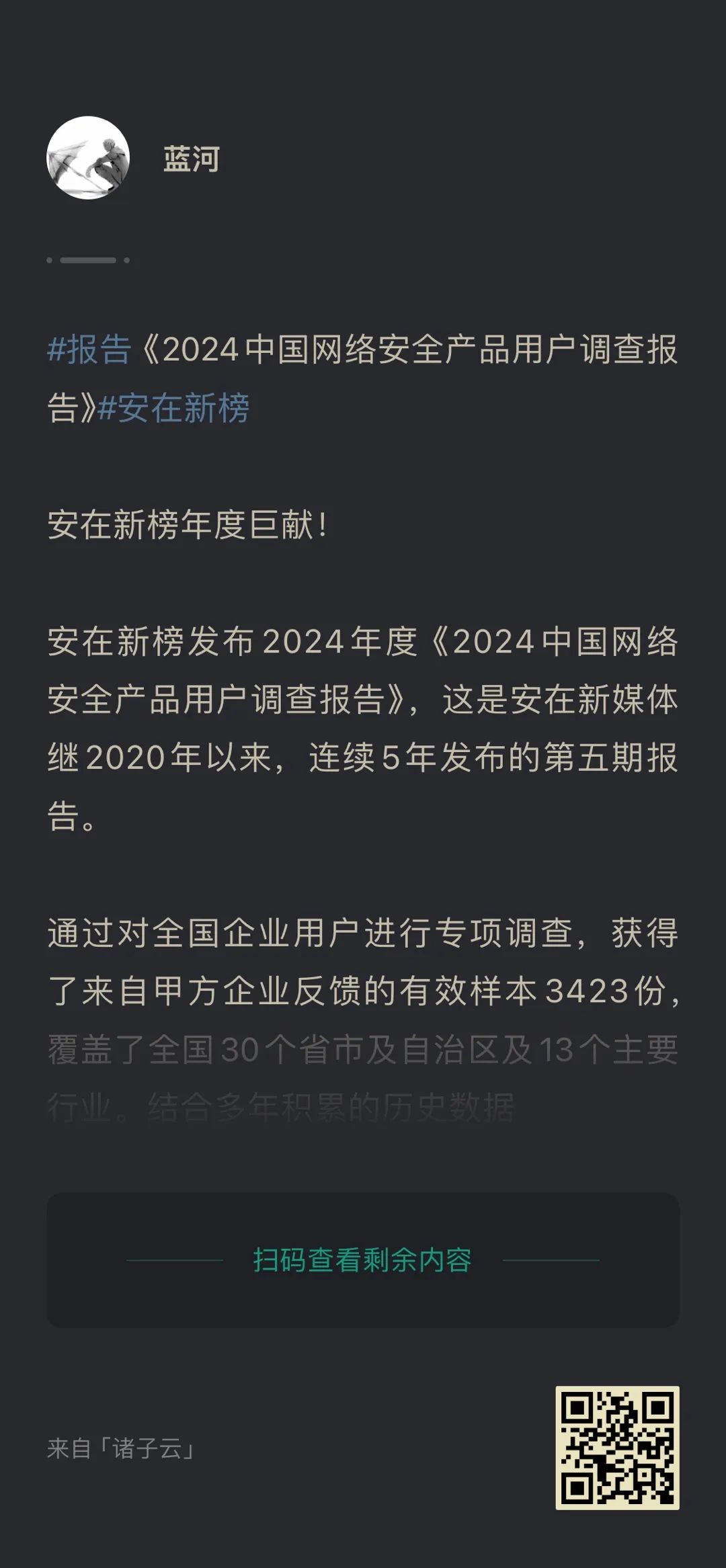 安在新榜《2024中国网络安全产品用户调查报告》完整版已上传「诸子云知识星球」,扫码加入即刻下载(下附优惠券)。