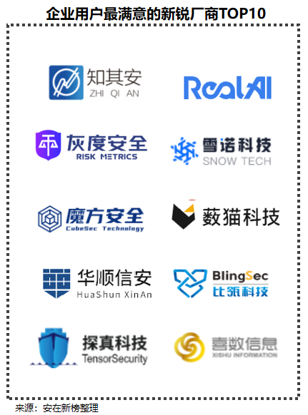 同时,报告在其中基于用户反馈及产品满意度情况,评选出十家“企业用户最满意的新锐厂商TOP10”,他们分别是:知其安、瑞莱智慧、灰度安全、雪诺科技、魔方安全、薮猫科技、华顺信安、比瓴科技、探真科技、喜数科技。