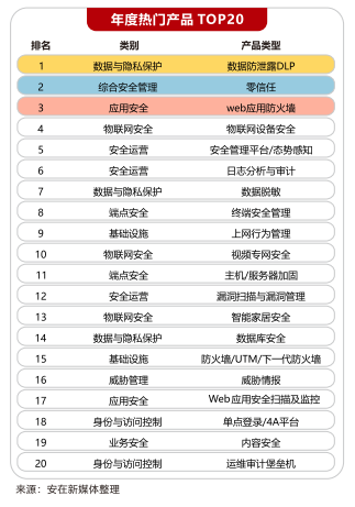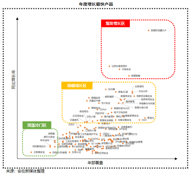 与上一年度对比显示,数据防泄露DLP、注册&登录保护、内容安全、数据脱敏等产品呈现出爆发增长趋势,而云数据安全、攻防靶场实训、放窃听/防偷窥、虚拟化安全、微隔离等产品部署量出现滞涨。