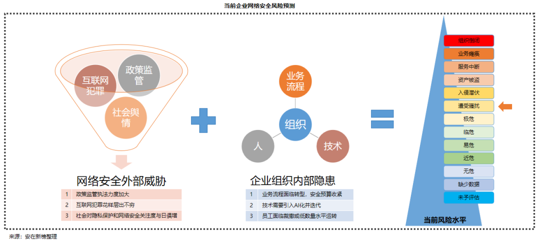 受外部环境威胁变化和内部降本增效,以及安全投资收紧的影响,预判2024年企业的风险水平为“遭受骚扰”级,部分企业将面临安全事件的影响,重点需要关注勒索病毒攻击和基于AI的欺诈。由于企业安全防御能力在本年度内将相对较低,建议加大事件应急机制的训练和维护,仅有的投资可以重点投入到应急响应,安全容灾等领域。