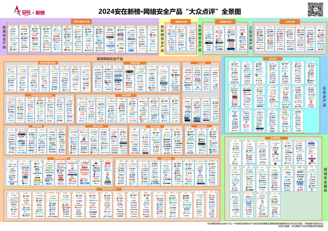 基于对以上品类产品的详细调查,报告发布了《2024安在新榜网络安全产品“大众点评”全景图》。(文末附高清免费下载链接)